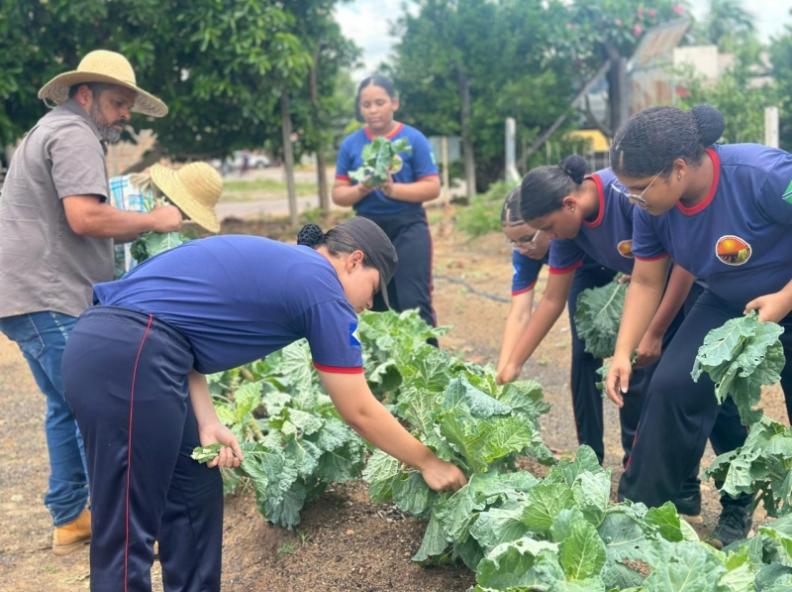 O projeto acontece ao longo de todo ano e as colheitas são realizadas de acordo com as produções locais. “Já fizemos uma colheita hoje de mandioca. Já colhemos alface, couve, cheiro-verde, abóbora. Daqui uns dias vamos colher tomate e hoje nós fizemos uma colheita de mandioca que esses alunos vão poder levar para casa. Além de eles estarem consumindo aqui no projeto, diariamente, o excedente levam para casa, para suas famílias poder ver o resultado desse trabalho”, explicou.