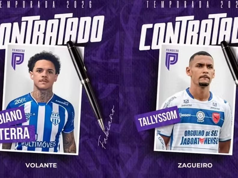 O Primavera segue movimentado no mercado e anunciou mais dois nomes para a temporada 2026: o zagueiro Tallys e o volante Fabiano Terra. As contratações elevam para oito o número de reforços confirmados pelo atual campeão mato-grossense, que disputará o Estadual, a Copa do Brasil, a Copa Verde e a Série D do Brasileiro.