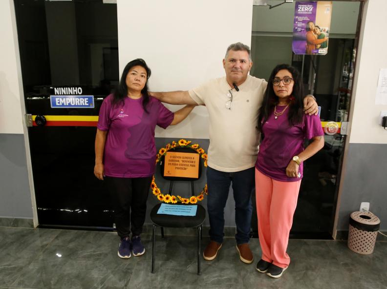 A cadeira, posicionada no saguão da Câmara, traz as frases: “O silêncio alimenta o agressor, denunciar é um passo essencial para proteção.” e “Esta cadeira está vazia porque uma mulher que poderia estar aqui foi vítima de feminicídio.”